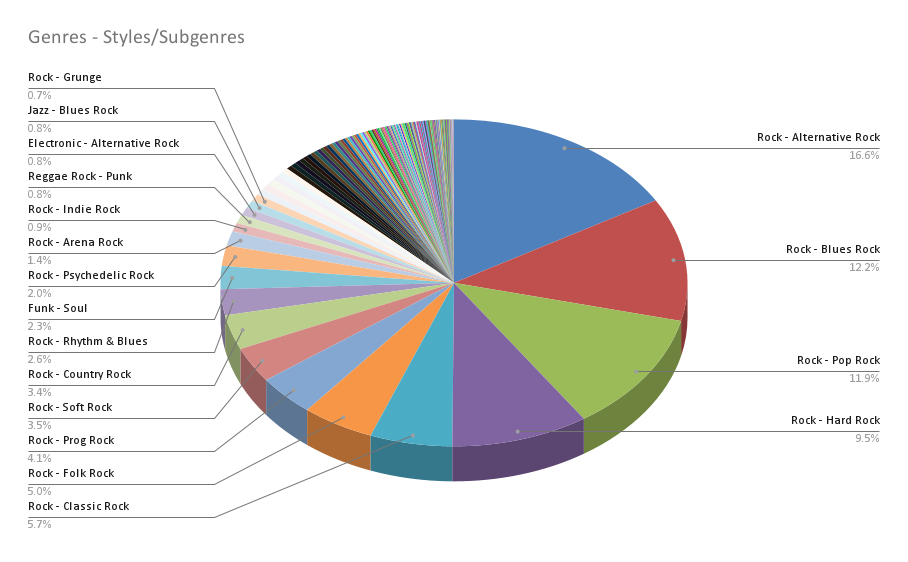 Primary genre: Rock in all its forms (sub-labeled extensively: Alternative Rock, Blues Rock, Pop Rock, Hard Rock, Classic Rock, Folk Rock, Prog Rock, Soft Rock, Country Rock, Psychedelic, Arena Rock, Indie, Grunge, Garage, etc.).